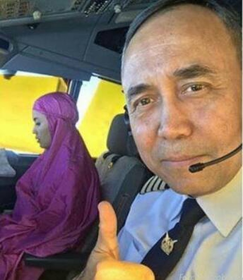 Dalam foto tersebut, nampak sang pilot sedang duduk di samping orang mengenakan mukena. Seseorang yang memakai mukena tersebut adalah kopilot wanita yang bernama Sarah Widyanti Kusuma.